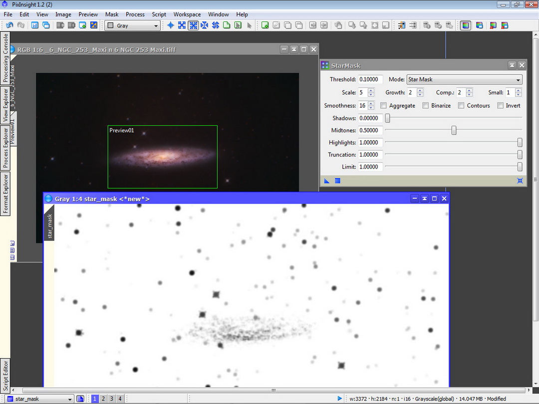 Para ellos hay muchos métodos, en Pixinsight, en sus ultimas ediciones, hay una herramienta que va muy bien a tal propósito, StarMask, la cual saca estas de la toma he invirtiendo la imagen como si fuera un negativo las partes negras no se procesan, se aplica, con el menú Mask.