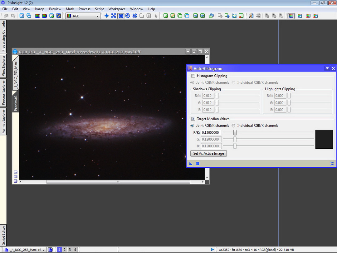 Me basare en una imagen mía de NGC 253, La galaxia del escultor, son 15 tomas de 10 minutos tomadas con una cámara Canon 400D con filtro de IR modificado Scott, a ISO 400, la Óptica es un reflector de la Marca Sky Wacher de 250 /1200, las condiciones de captura, eran buenas, aunque es un objeto que tomado desde mi latitud en este caso Lleida / España, queda muy cerca del horizonte Sur, la imagen en bruto para seguir y practicar el tutorial la podéis bajar de AQUI , tiene 45 Mb de tamaño por lo que tardara un poco en descargarse.
